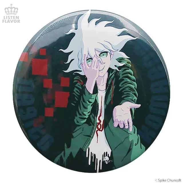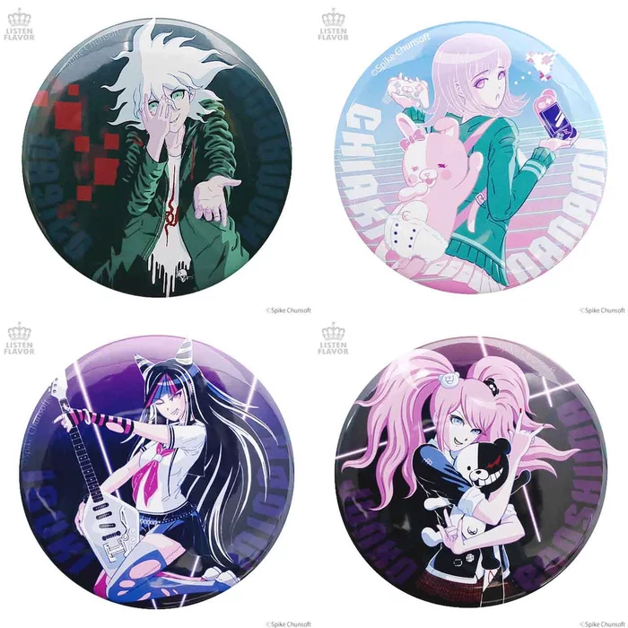 Add some stylish Danganronpa flair to your look! Part of a collaboration between popular Japanese Harajuku fashion brand LISTEN FLAVOR and Danganronpa, these collectible pin badges feature artwork of Nagito Komaeda, Chiaki Nanami, Ibuki Mioda, and Junko Enoshima each in a characteristic pose with their name around the outside. Pin them to your ita-bag!