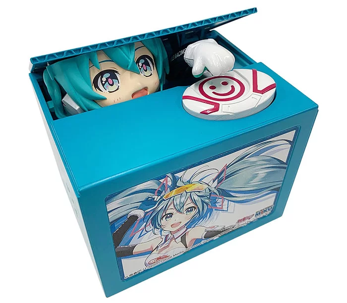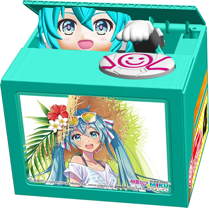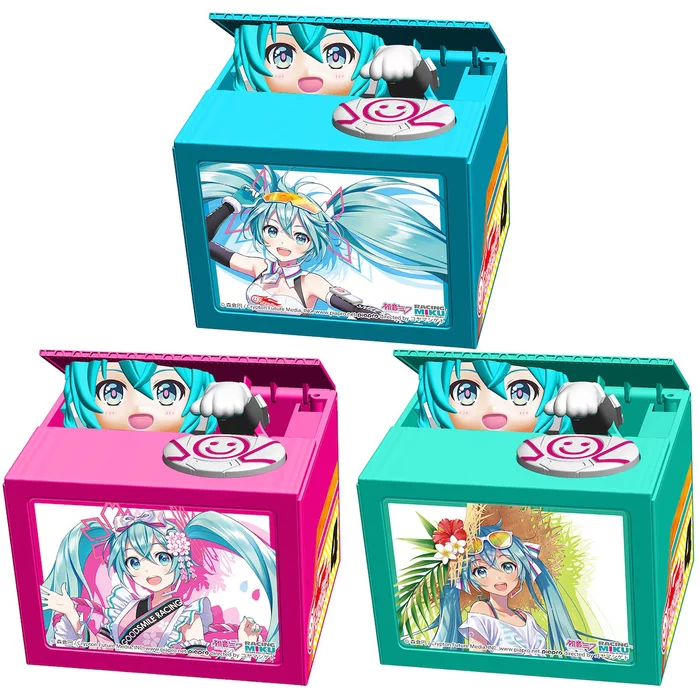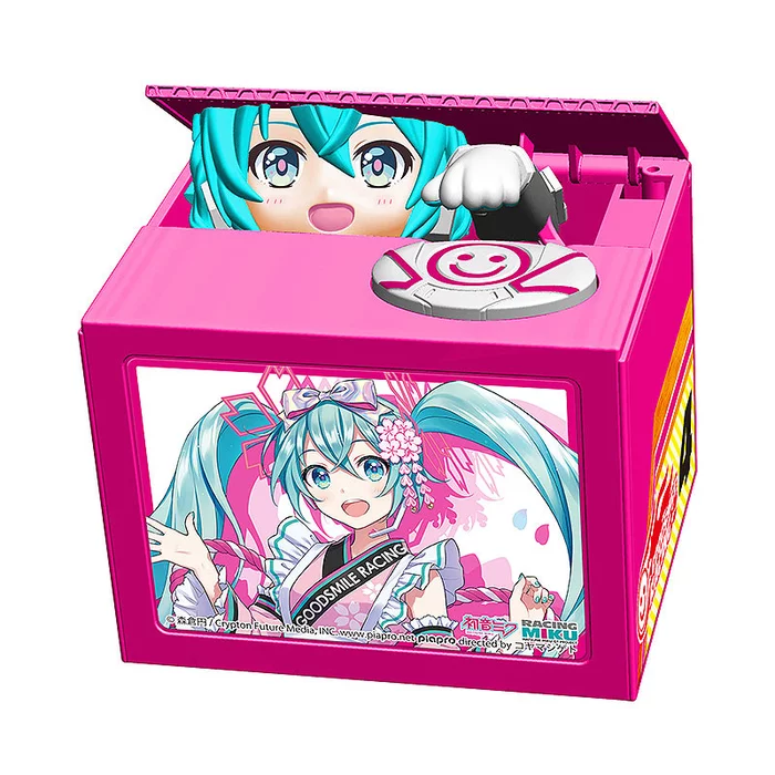 En Morikura's Racing Miku 2021 design becomes a talking coin bank!From SHINE as a part of the Hatsune Miku GT Project comes this third lineup of talking and moving Racing Miku coin banks. Available in three different colors each with different artwork and stickers, just place a coin down on the tray featuring the Good Smile Company logo and Miku will peek her head out of the box to take your coin! What’s more, she’ll say all sorts of phrases or even grace your ears with her melodic singing voice while she reaches for your coin! Saving has neve been easier!